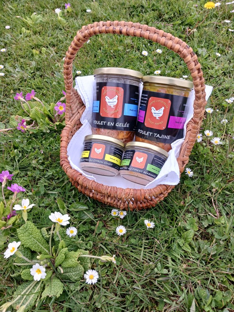 Vous trouverez des poulets frais prêt à rôtir, et une gamme de bocaux, cuisinés maison aux saveurs uniques : du poulet basquaise, en gelée, en tajine, à l’oignon, des rillettes nature à la graisse de canard, au piment béarnais ou encore au citron confit, une pure merveille.